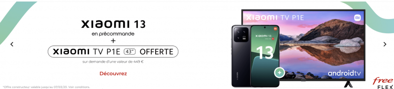 Jusqu’au 7 mars, il est possible de précommander le nouveau Xiaomi 13 chez Free Mobile en achat comptant ou via Free Flex. Une offre spéciale est lancée à l’occasion de la commercialisation de ce nouveau flagship : la TV connectée Xiaomi P1E est offerte pour tout achat.