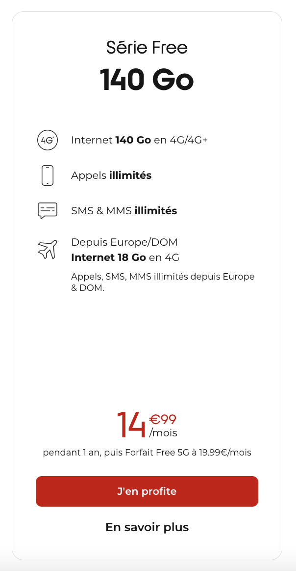Ce 2 mars, l’ex-trublion booste une nouvelle fois son offre, laquelle inclut désormais 140 Go toujours au même prix, à savoir 14,99€/mois pendant 1 an avant de basculer vers le forfait 5G 210 Go à 19,99€/mois. L’enveloppe de données en roaming (Europe/DOM en 4G) est de 18 Go.