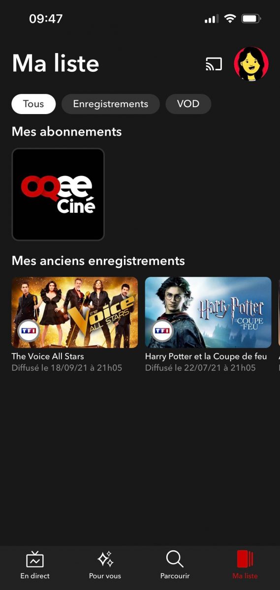 Sur mobile, l’accès à Oqee Ciné est directement proposé dans la section “Ma Liste”, dans la catégorie “Mes abonnements”.
