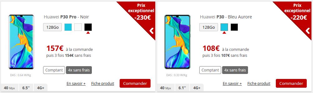 - Le Huawei P30 Pro quant à lui voit son prix passer à 619€ contre 849€ auparavant, soit une baisse de 230€. En 4x sans frais, il coûtera 157€ lors de la première commande, puis 3 fois 154€ sans frais.