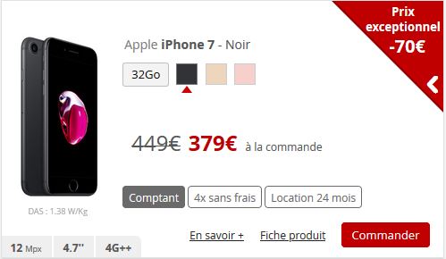 L’iPhone 7 voit son prix baisser de 70€ et passe donc de 449€ à 379€. Vous pouvez également vous le procurer en 4 fois sans frais pour 97€ à la commande, puis trois fois 94€. Si vous préférez la location 24 mois, comptez 99€ à la commande puis 10€ par mois.
