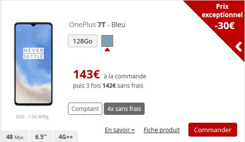Le OnePlus 7T bénéficie d’une baisse de prix de 30€ , son prix passe ainsi de 599€ à 569€ au comptant. Il est également disponible en payant en 4 fois sans frais avec 143€ à la première commande, puis trois fois 142€. Vous pouvez retrouver notre test du OnePlus 7T en cliquant sur ce lien.