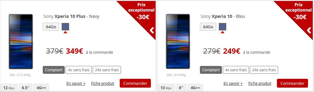 Les Sony Xperia 10 Plus et Xperia 10 bénéficient tous les deux d’une baisse de prix de 30€. Ainsi, le Xperia 10 Plus passe à 349€ au comptant, la réduction s’applique également pour le paiement en 4x sans frais (88€ à la commande puis trois fois 87€) et en 24 fois sans frais (157€ à la commande, puis 24 fois 8€).