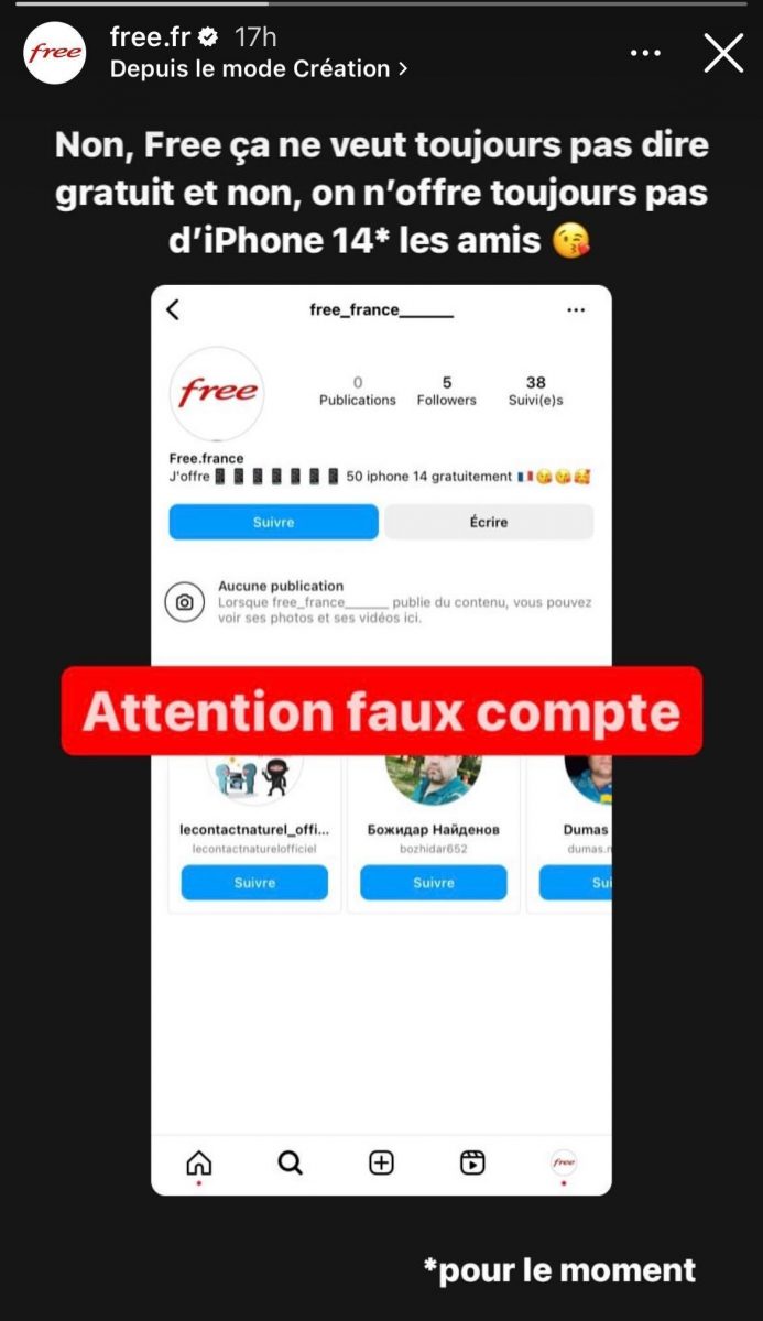 Si les célébrités subissent souvent des usurpations d’identité sur Instagram, les opérateurs ne sont pas épargnés. Dans une story publiée sur le compte officiel @free.fr, l’opérateur rappelle qu’il ne faut pas toujours faire confiance à son logo.