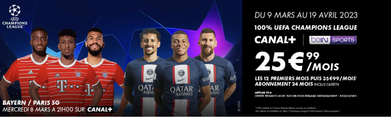 “Profitez de 100% des matchs de l’UEFA Champions League, et rien que les matchs, diffusés sur les chaînes Canal+, Canal+ Foot et beIN sports et accédez également à la totalité des contenus de l’offre Canal+”. Du 9 au 19 avril 2023, la filiale de Vivendi propose une nouvelle offre pour le moins sportive. Celle-ci inclut dans le détail les chaînes Canal+, Canal+ Foot, Sport 360, Cinéma, Grand Ecran, Docs, Kids et Séries, et beIN Sports. Bémol, la chaîne sportive du groupe qatari sera “seulement accessible pendant les matchs de la Ligue des Champions”, précise le groupe. Le prix, 25,99€/mois pendant 12 mois puis 35,99€/mois avec un engagement de 24 mois (1 mois pour essayer).