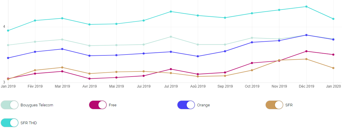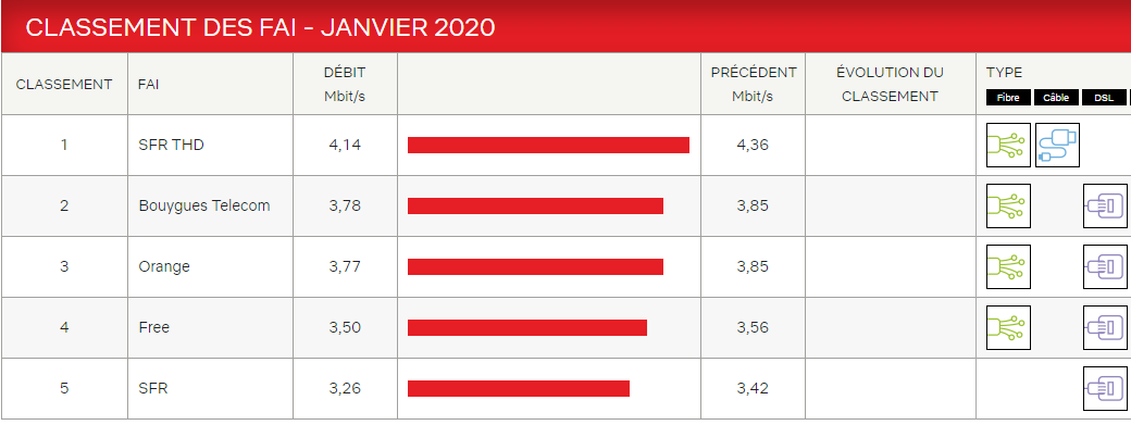 Concrètement, au cours du mois de janvier SFR “THD” (anciennement Numéricable) conserve sa place de numéro un avec un débit moyen de 3,14 Mbits/s en baisse par rapport au mois dernier (3,36 Mbits/s). En deuxième position, Bouygues Télécom, affiche 3,78 Mbits/s contre 3,85 Mbits/s le mois précédent. A la 3ème place on trouve Orange avec 3,49 Mbits/s, en baisse par rapport à décembre. Free se place en 4ème position, avec 3,50 Mbits/s (contre 3,56 Mbits/s le mois précédent), soit la baisse la moins importante du mois (-0,6 Mbits/s) et enfin SFR à la 5ème place avec 3,26 Mbits/s, qui continue à baisser.