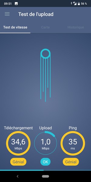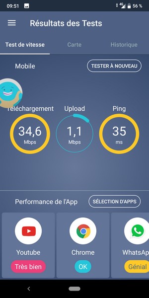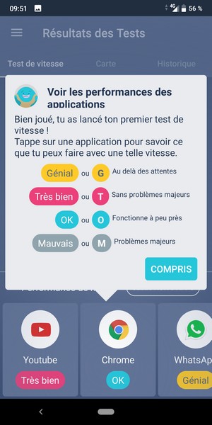Proposée sur les smartphones Android et iOS, l’application Meteor fait partie de nombreuses applications permettant de tester la qualité de sa connexion Internet. À l’issue des tests, elle chiffre le débit descendant, le débit montant et le ping, mais indique aussi si la connexion est suffisante pour les applications, celles indiquées par défaut et celles ajoutées par l’utilisateur (jusqu’à 6 en tout). Des codes couleur permettent de comprendre rapidement les résultats. Les néophytes peuvent également compter sur un compagnon virtuel (le Monstre Cosmique), que l’on peut solliciter en tapotant dessus, pour obtenir quelques explications concernant les fonctionnalités. Notez d’ailleurs qu’on peut le désactiver dans les paramètres.
