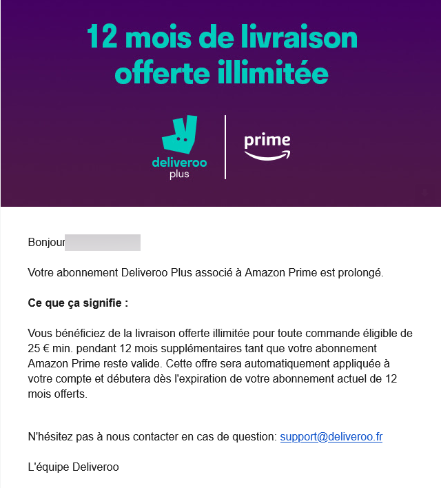 Ce service, lié à la plateforme de commande à domicile, permet de bénéficier de la livraison offerte illimitée pour toute commande éligible de 25€ minimum. Dans son mail, Deliveroo explique ainsi qu’une nouvelle promotion est appliquée sur votre abonnement à la fin de l’offre actuelle, pour une durée de 12 mois. A noter cependant, cette offre n’est valable que si votre abonnement Prime reste actif.