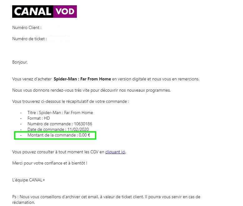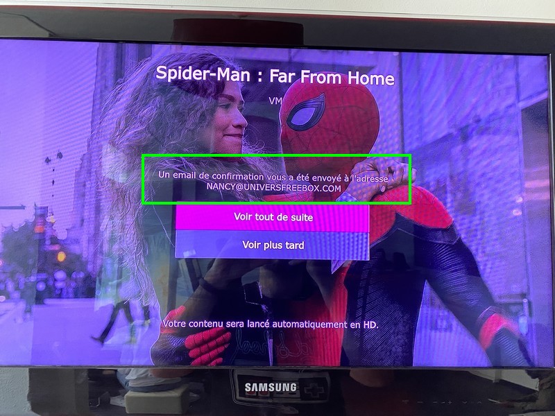 Une fois l’achat effectué, celui-ci est confirmé au sein de l’interface TV et grâce à un e-mail confirmant au passage le coût de 0 euro.