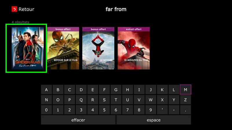 Une fois dans le service Canal VOD, accédez au champ de recherche, afin de trouver le film “Spider-Man : Far From Home” et ouvrir sa fiche.