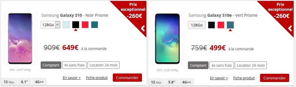 - Le Samsung Galaxy S10e voit quant à lui son prix passer de 759€ à 499€. En 4 fois sans frais, il faudra débourser 127€ à la commande, puis trois fois 124€ sans frais. Pour les adeptes de la location, comptez une première commande de 129€ puis 20€/mois. Vous pouvez retrouver notre test du Galaxy S10e ici.