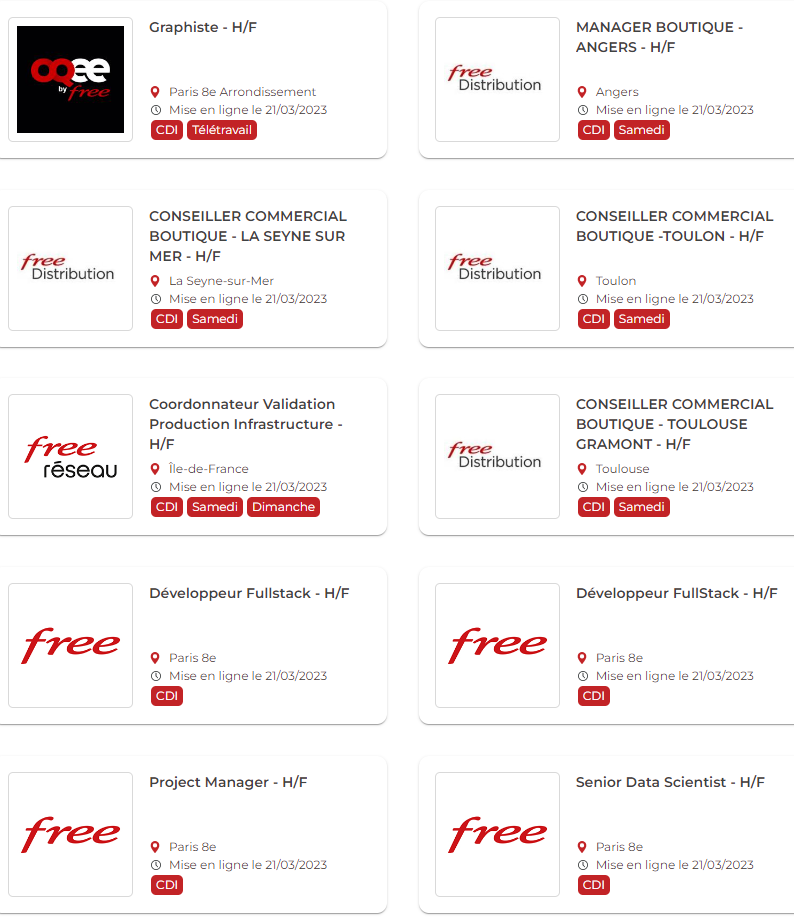 Free lance une nouvelle vague de recrutements, et il y en a pour tous les goûts : Graphiste OQee, managers et conseillers Free Center, développeurs, etc.