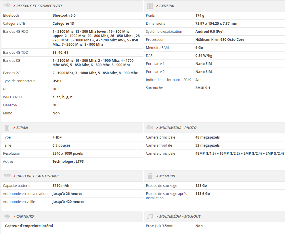 Il est équipé d’un processeur Kirin 980, de 6 Go de RAM et 128 Go de stockage interne, d’un capteur d’empreintes digitales sur la tranche, ainsi que d’une batterie de 3 750 mAh compatible avec une charge rapide 22,5 W. Le smartphone est muni d’un système de reconnaissance faciale, mais dépourvu de prise mini-jack 3,5 mm.