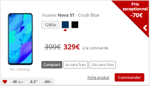 Le smartphone est ainsi proposé à 399€ (contre 429€ auparavant). Il est également disponible en 4 fois sans frais, pour 102€ à la commande puis trois fois 99€, ou en 24 fois sans frais 207€ à la commande puis 8€ durant 24 mois 24 Il est proposé en deux coloris, Crush Blue et Noir en version 128Go. A cela s’ajoute une nouvelle remise exceptionnelle (la durée n’est pas précisée) de 70, ce qui porte ce smartphone au tarif final de 329€.