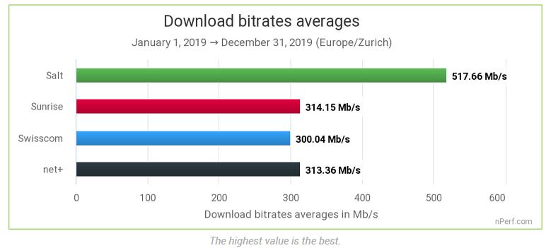 Avec la fibre 10 Gb de son côté, le débit descendant moyen de Salt est loin devant la concurrence, avec 517.66Mb/s, contre 300.04 Mb/s pour Swisscom par exemple.