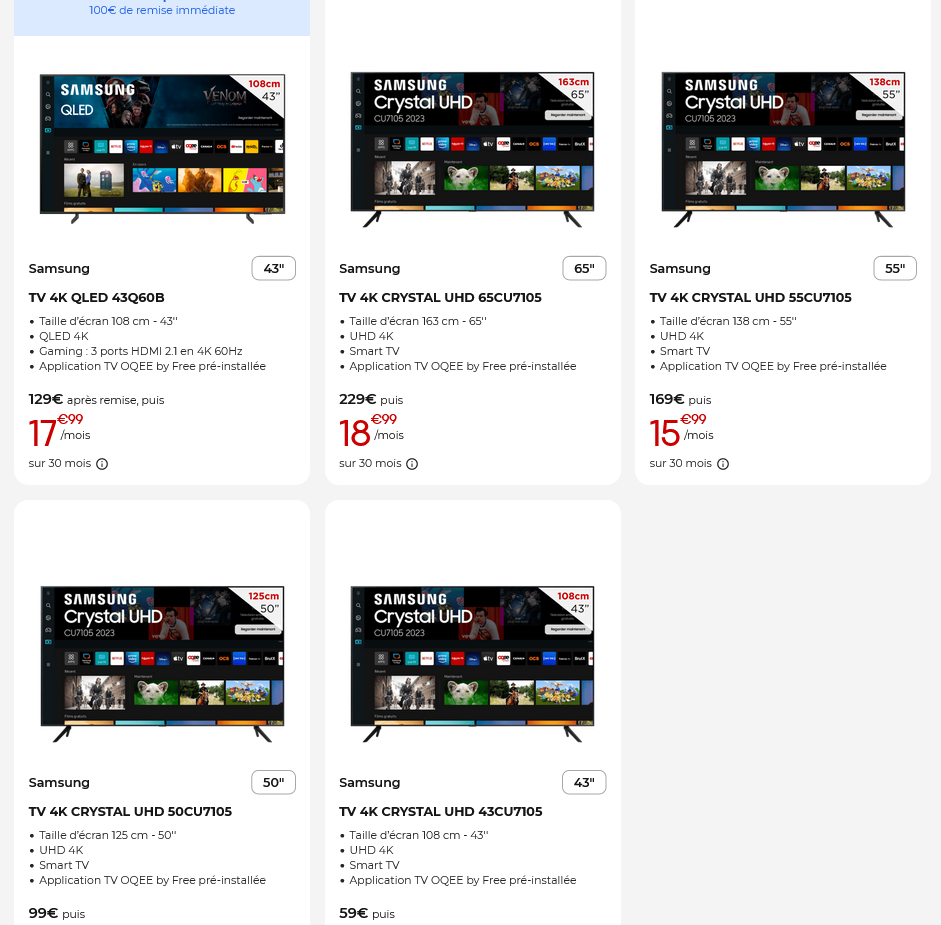- 43″ : 59€ à la commande puis 13.99€/mois pendant trente mois (479€ au total)