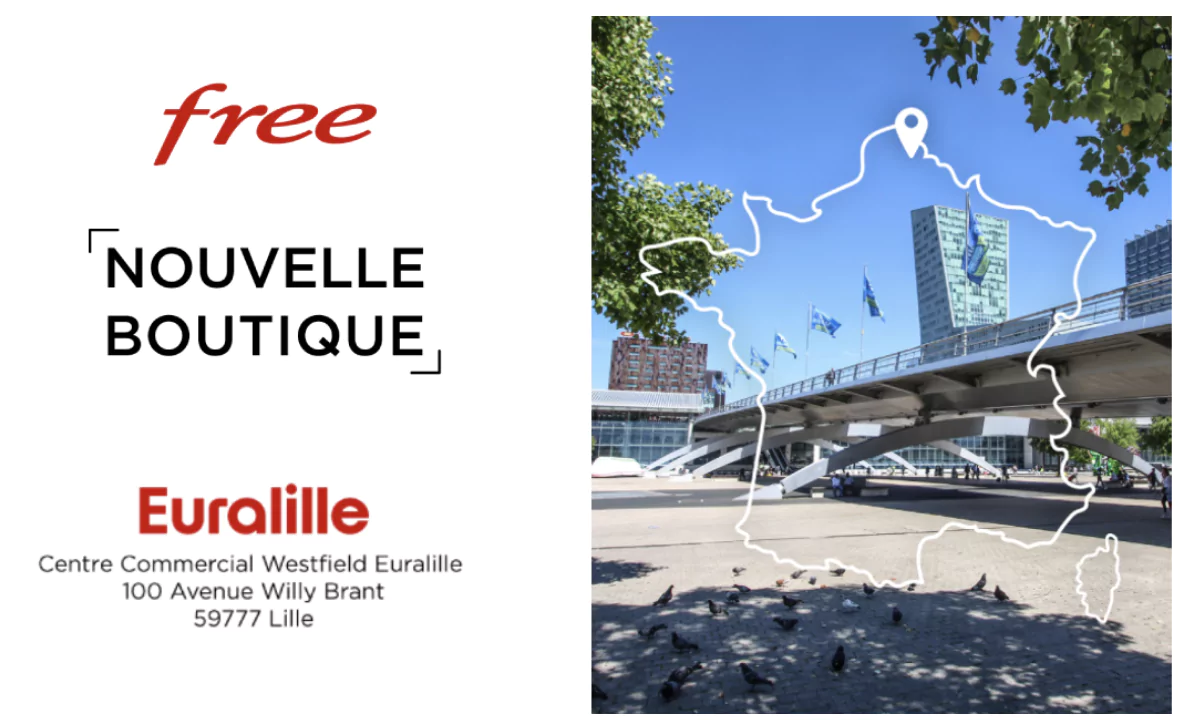 Une troisième inauguration de Free Center en 2023. Après Neuilly-sur-Seine, puis Annemasse, Free a ouvert le 29 mars une 2e boutique à Lille au sein du centre commercial Westfield Euralille. De quoi renforcer un peu plus sa présence physique puisqu’il compte déjà une boutique dans le centre ville de la “Capitale des Flandres”, au 6 rue des Manneliers. Les abonnés et prospects peuvent aussi compter sur un espace de vente et conseil de Free au sein de centre commercial V2 de Villeneuve D’asq ou à Englos, tous deux situés à seulement quelques kilomètres.