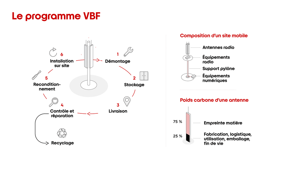 “Le programme VBF permet ainsi de multiplier par 2 ou 3 la durée de vie des antennes, en évitant l’obsolescence d’usage. Sachant que l’extraction des matériaux nécessaires à la fabrication d’une antenne représente 75% de son bilan carbone, c’est aussi un levier efficace pour diminuer l’impact carbone du réseau mobile. Free Mobile prévoit d’équiper 30% de ses nouveaux sites mobiles avec des antennes reconditionnées d’ici 2025, ce qui représente une économie de 600 tonnes équivalent CO2″ explique l’opérateur.