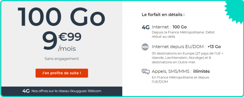 Cdiscount Mobile commercialise un forfait 100 Go (débit ajusté au-delà) à 9,99 euros avec uniquement la 4G. Ce forfait comprend par ailleurs les appels, SMS et MMS illimités, ainsi qu’une partie roaming avec 13 Go de data mobile utilisables depuis l’Europe et les DOM. Cdiscount Mobile passe par le réseau de Bouygues Telecom. Evidemment lors de la commande il faudra débourser 10€ pour la carte SIM.