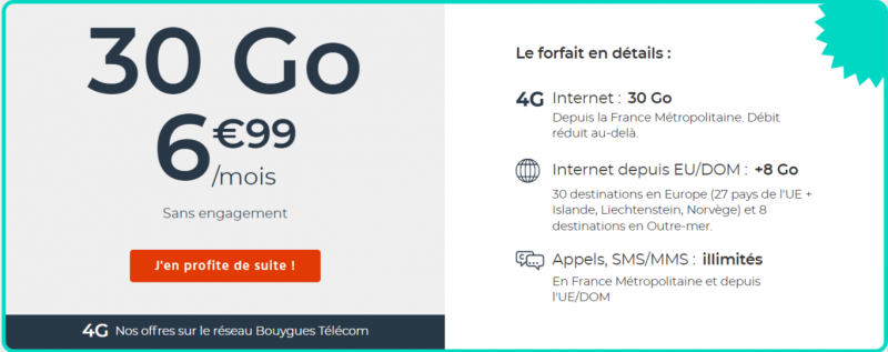Pour ceux qui n’auraient pas l’utilité d’une grosse enveloppe data sur leur mobile, Cdiscount Mobile propose également un forfait à petit prix avec un petit volume de data. Pour 6,99€ par mois, Cdiscount Mobile propose un forfait offrant 30 Go d’internet mobile en 4G. Avec les SMS/MMS et appels illimités. Profitez également de 8 Go d’internet en roaming en Europe et DOM.