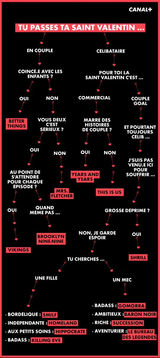 Célibataire (endurcis), en couple ou à la recherche de l’amour, Canal + Séries vous a préparé une sélection de séries à regarder en ce jour de la Saint-Valentin, en fonction de votre situation amoureuse. Selon votre statut et des réponses que vous donnerez aux différentes questions aboutira à une proposition de séries a regarder. N’hésitez pas a nous dire en commentaire quelle série vous correspond.