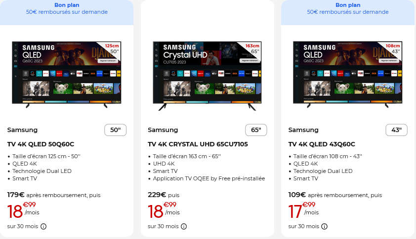 Payer en 30 mois sa TV connectée pour adoucir l’achat, c’est la proposition faite aux abonnés Freebox par Free depuis plusieurs mois. De nombreux modèles sont proposés et le catalogue change régulièrement. Depuis quelques jours, deux nouveaux modèles QLED sont proposés.