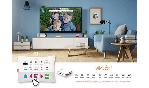 Fonctionnant de concert avec une box connectée à Internet (Ethernet ou Wi-Fi) et raccordée au téléviseur (RCA ou HDMI), avec laquelle il communique en Bluetooth, le coussin intelligent Viktor propose des grands boutons pour consulter ses messages, visualiser son agenda, lancer de la musique ou des livres audio, afficher des photos et demander aux proches de rappeler. Grâce à la webcam Logitech fournie dans le pack, l’utilisateur peut également lancer des appels vidéo en qualité HD.
