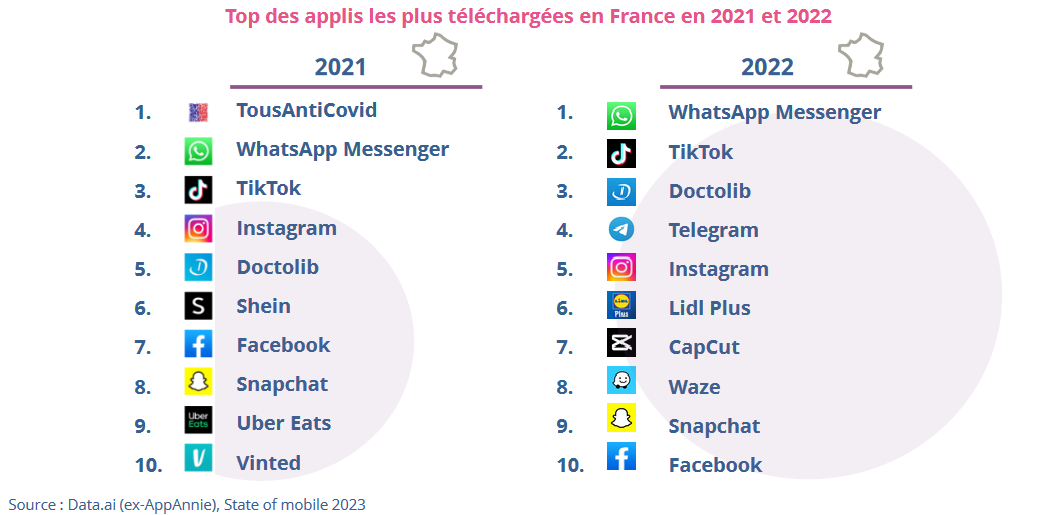 La tendance globale reste cependant la même : ce sont avant tout les applications de réseaux sociaux (quatre en comptant Snapchat) et de messagerie (3 en comptant Snapchat) qui sont les plus téléchargées. Si en 2020 et 2021, TousAntiCovid avait été portée à la première place du classement du fait de la crise sanitaire, WhatsApp a repris la médaille d’or en 2022, suivi de TikTok et de Doctolib, qui a dépassé Instagram en terme de téléchargements.