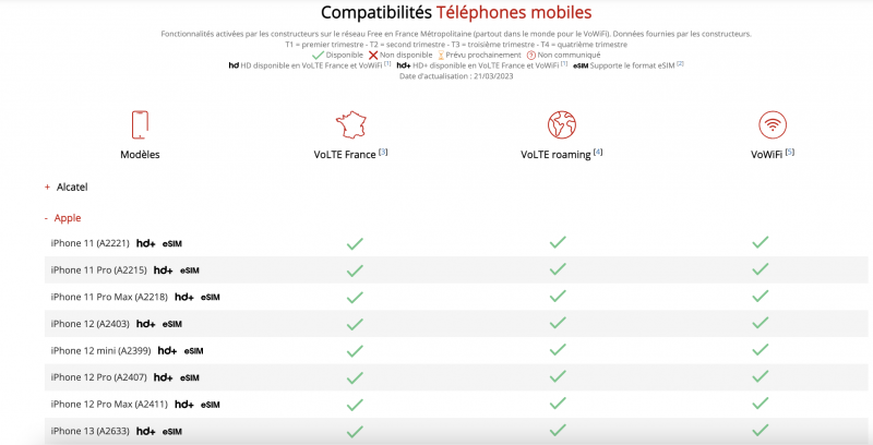 Free Mobile met à jour ses tableaux présentant les modèles de smartphones compatibles avec la voix sur 4G et voix sur WiFi. La disponibilité de l’eSIM est désormais indiquée.