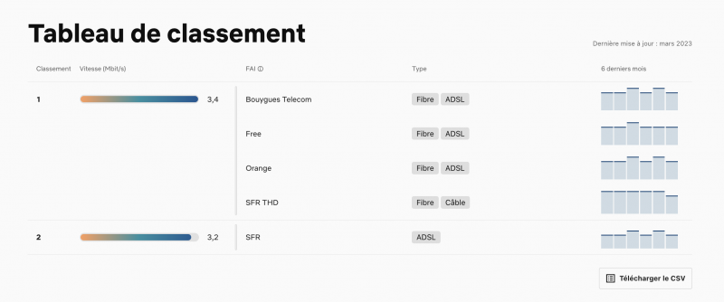 La moyenne française des débits s’élève ainsi à 3,4 Mbits/s comme en Allemagne, Argentine, Australie, Autriche, Brésil, Chili, Corée du Sud, Équateur, Finlande, Inde, Irlande, Israël, Italie, Japon, Luxembourg, Nouvelle-Zélande, Panama, Paraguay, Pérou, Philippines, Roumanie, Royaume-Uni, et Uruguay.