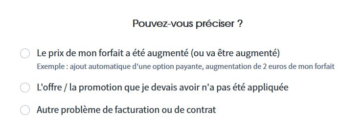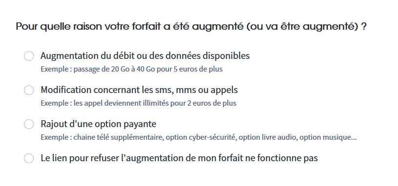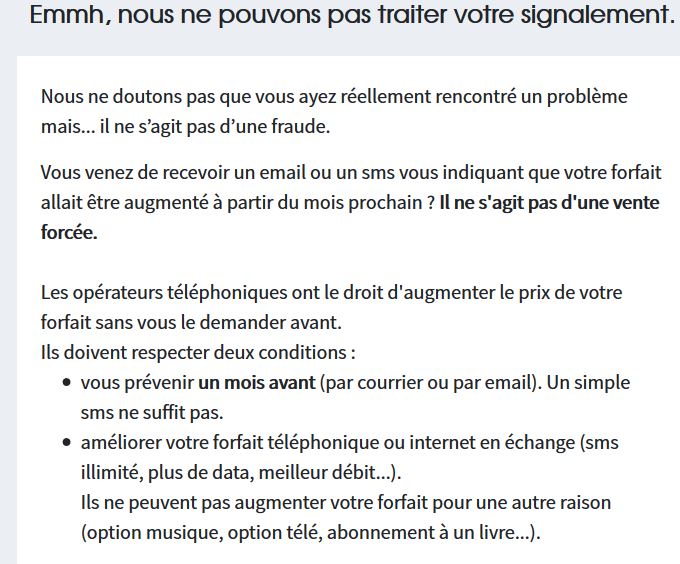 Puis, selon votre problème, vous pourrez être redirigés vers deux types de pages. La première, par exemple avec l’augmentation du débit ou de la data disponible, vous indiquera qu’il ne s’agit pas d’une fraude et que vous n’avez que deux choix : résilier votre abonnement ou accepter l’augmentation. La DGCCRF précise que si l’opérateur vous a bien prévenu par mail ou par courrier un mois avant et qu’il ne s’agit que d’améliorer votre forfait téléphonique, il est dans son droit. Cependant, votre opérateur ne peut pas augmenter votre forfait pour une autre raison, comme une chaîne de télévision supplémentaire, une option de livre ou même une option de cyber-sécurité.
