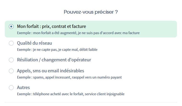 Puis, vous pourrez faire défiler au fur et à mesure de la description de votre souci pour détailler et préciser votre cas. Ici par exemple dans le cas d’une augmentation de forfait.