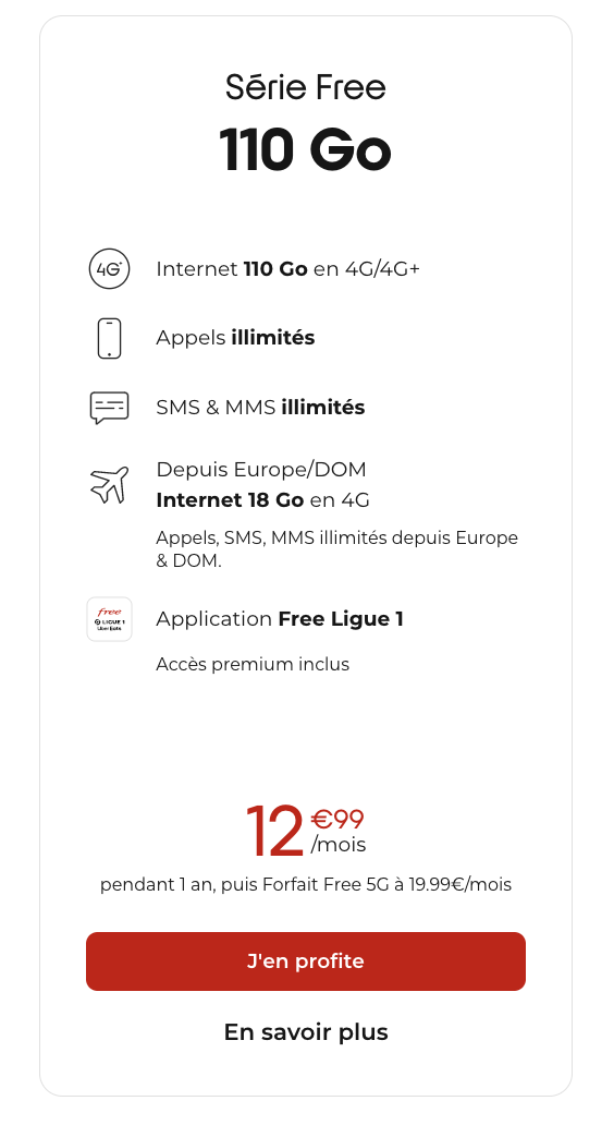Ce 14 avril, l’opérateur modifie ainsi son offre Série Free, laquelle passe de 140 Go à 110 Go au prix de 12,99€/mois pendant 1 an contre 14,99€/mois précédemment. Les nouveaux souscripteurs basculeront après 12 mois vers le forfait 5G 210 Go à 19,99€/mois. L’enveloppe de données en roaming (Europe/DOM en 4G) est de 18 Go.