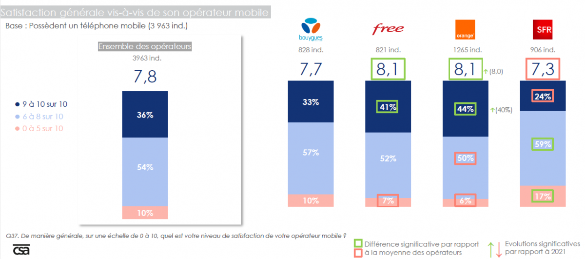 La satisfaction globale est en très légère hausse de 0.1 points par rapport à l’année précédent. Les 2787 abonnés fixe ou mobile ayant évalué Orange lui ont attribué une note moyenne de 8/10, une note en hausse par rapport à l’année dernière (7.9/10). Free de son côté compte moins d’abonnés interrogés que l’opérateur historique mais davantage que ses deux autres concurrents et obtient une note de 7.9/10. Vient ensuite Bouygues Telecom avec une moyenne de 7.6/10 puis SFR avec 7.2/10.