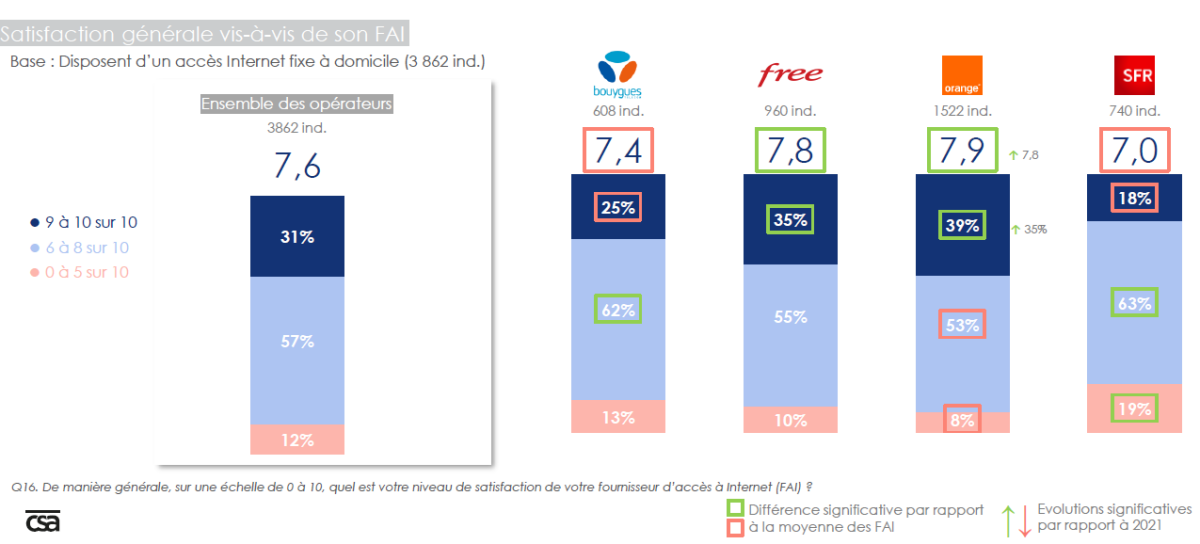 La note générale est un peu plus basse en ce qui concerne l’accès à internet chez soi. La moyenne est à 7.6/10 et Orange obtient une note 7.9 tandis que Free est évalué à 7.8/10. C’est dans ce domaine que SFR a la plus mauvaise note avec 7/10 de satisfaction uniquement.