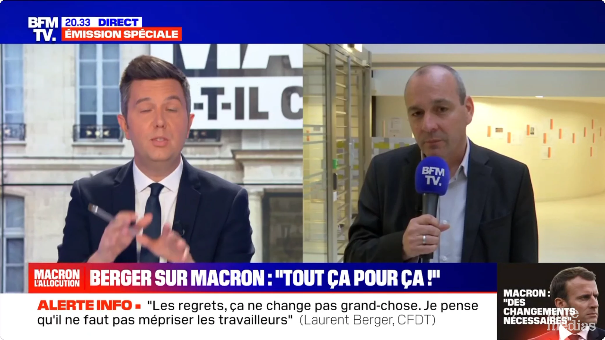 Suite au discours d’Emmanuel Macron, le secrétaire général de la CFDT, Laurent Berger, a exprimé son opinion sur le plateau de BFMTV.