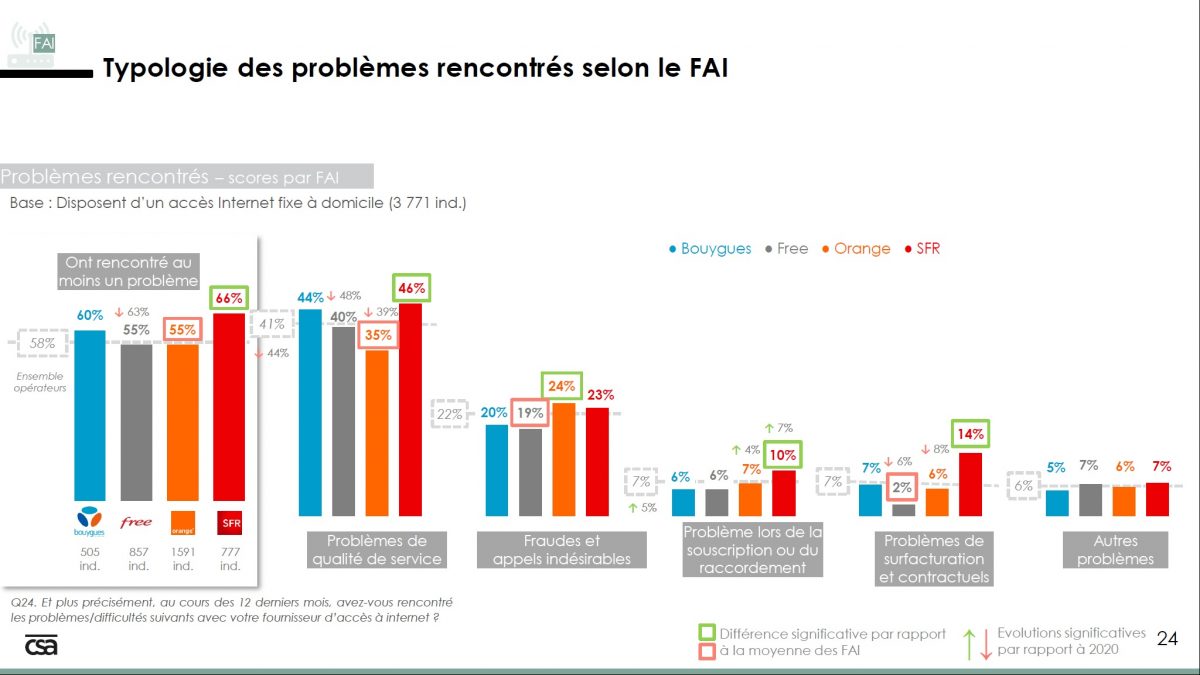Parmi les 3 771 individus disposant d’un accès internet fixe chez eux interrogés, 857 étaient abonnés Free, 1591 chez Orange, 777 chez SFR et 505 chez Bouygues Telecom. On peut noter qu’en moyenne 58% des abonnés ont rencontré au moins un problème avec leur opérateur dans les 12 derniers mois, mais que Free et Orange se démarquent en étant les seuls opérateurs à se situer sous cette moyenne (55%). L’opérateur de Xavier Niel s’est nettement amélioré avec un taux de 63% en 2021. Les soucis sont plus récurrents chez SFR (66% d’abonnés avec un problème) et dans une moindre mesure chez Bouygues Telecom (60%).