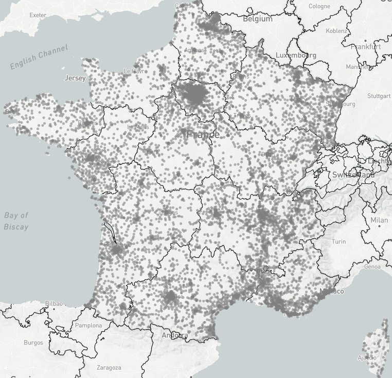 Mais une carte étant plus parlante que de longs discours, on peut découvrir celle des sites 4G qui disposent de 3 bandes de fréquences actives, et donc qui permettent la 4G++. Comme on peut le constater ci dessous, Free, en gris, est nettement plus présent que ses concurrents, en particulier sur les zones hors grandes agglomération.