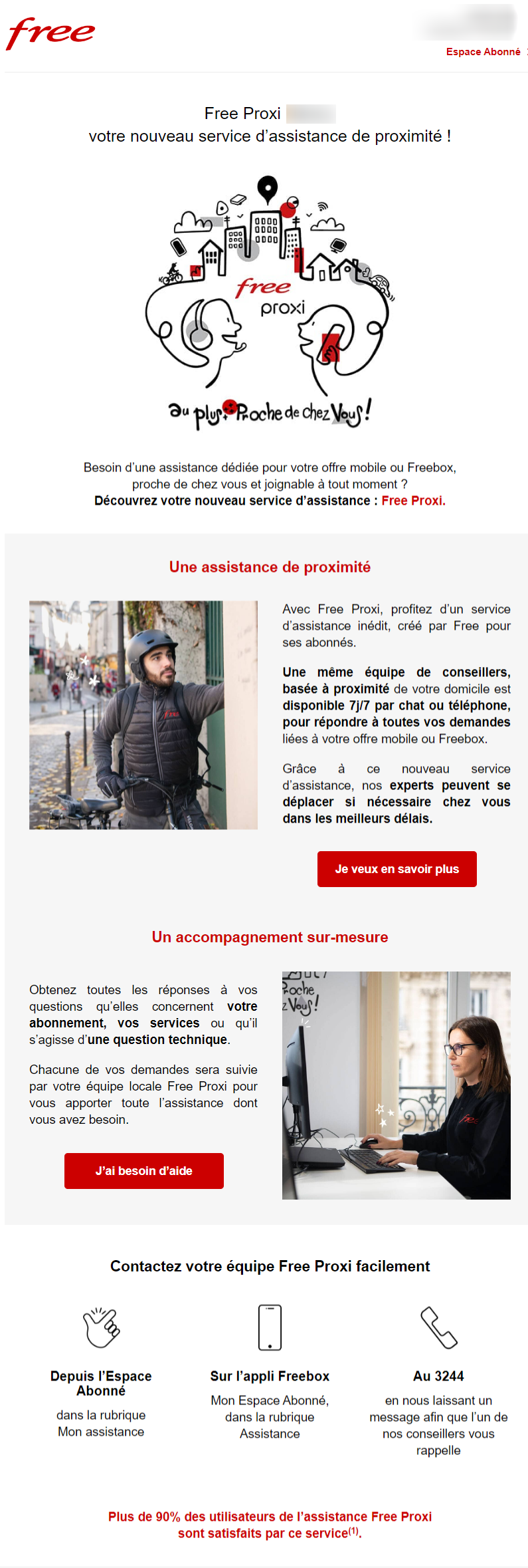 Free Proxi est le nouveau service d’assistance de proximité lancé par Free en novembre dernier. Celui ci compte déployer des équipes de proximité comptant 8 à 10 conseillers implantées dans toute la France à terme. A ce jour, déjà 150 Free Proxi, ont été lancés et pour informer les abonnés Freebox et Free Mobile dès qu’il peuvent en bénéficier, l’opérateur envoie un mail qui explique le fonctionnement de ce service.