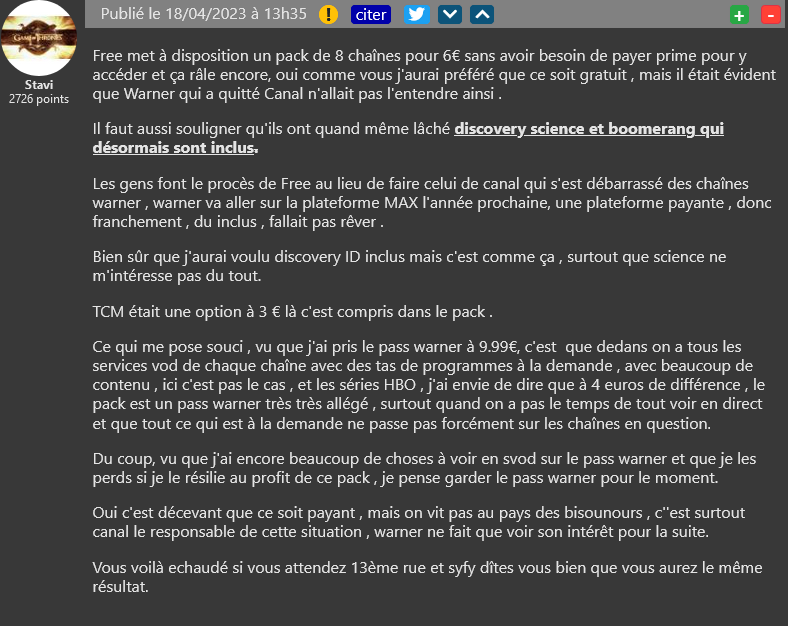 Free a lancé la semaine dernière un nouveau pack en accord avec Warner comprenant de nombreuses chaînes, dont certaines très attendues comme Discovery Channel. Certains auraient cependant aimé, comme ce fut le cas pour Discovery Science, qu’elles soient intégrées directement dans le bouquet Basic. Pour Stavi et d’autres lecteurs, il faut relativiser.