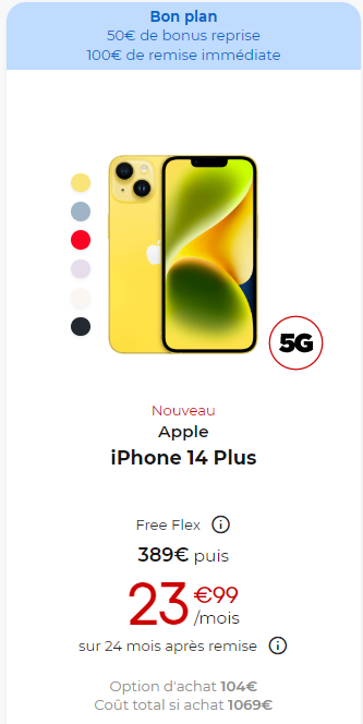 Le deuxième smartphone concerné est l‘iPhone 14 128Go qui bénéficie d’une remise immédiate de 100€ ainsi que d’un bonus de reprise de 50€.