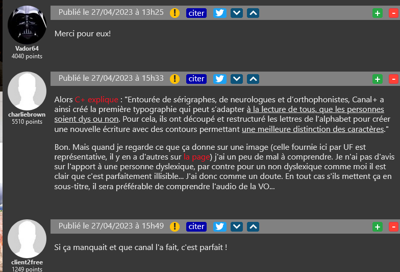 Les programmes de Canal+ seront bientôt proposés avec des “dystitles”, nouveau genre de sous-titres adapté aux personnes dyslexiques sur ses programmes dès l’été prochain. Les typographies actuellement utilisées rendent difficile le visionnage de séries ou de films en version originale du fait du temps qu’il faut pour ces personnes à déchiffrer le texte. Cependant, certains relèvent que les exemples fournis paraissent assez difficile à lire pour les personnes ne souffrant pas de ce trouble. Une question d’habitude à prendre ? L’initiative a tout de même été saluée par la plupart des Freenautes.