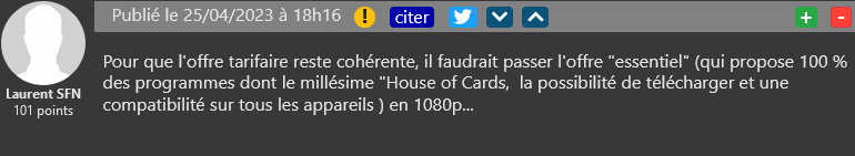 La semaine dernière, le géant du streaming revoyait son offre “Essentiel avec pub” en France, améliorant la qualité d’image disponible pour les abonnés et permettant l’utilisation sur deux supports en même temps. Des avantages autrefois réservé à l’offre Standard de Netflix, d’où un changement de nom : Standard avec Pub. Avec une différence de prix assez importante, puisque la nouvelle offre est toujours proposée à 5.99€/mois, tandis que la formule Essentiel (720p) est à 8.99€ et la Standard classique est à 13.49€/mois.
