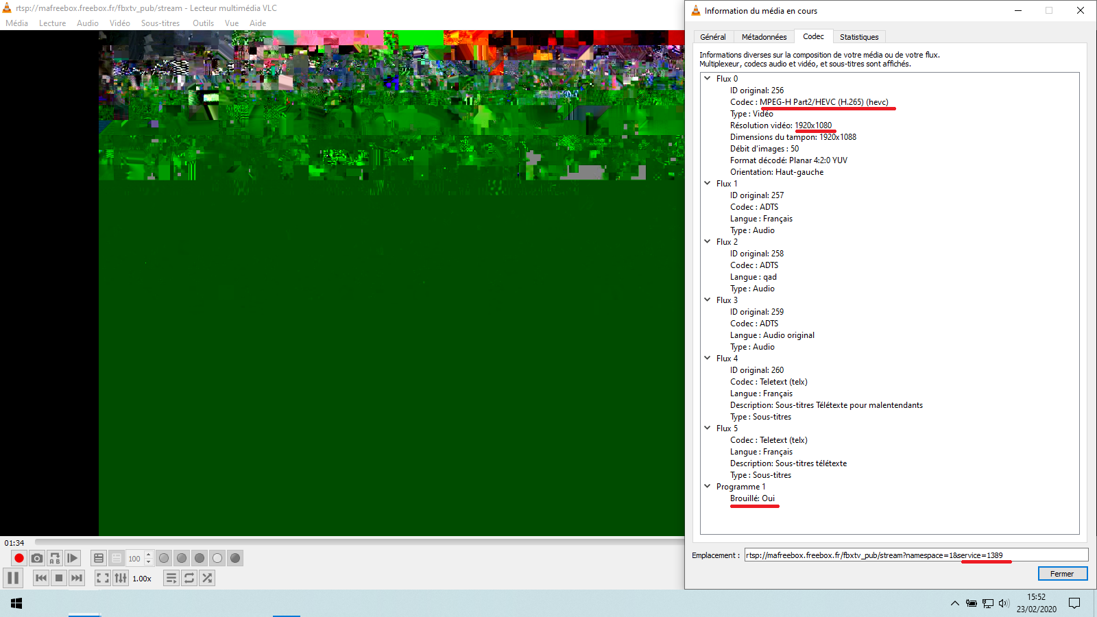 Afin que l’on ne sache pas de quel flux TV il s’agit, Free les a brouillé, c’est à dire protégés pour que l’on ne puisse lire ni la vidéo ni l’audio. Mais il est toutefois possible d’avoir quelques détails techniques sur ces derniers.