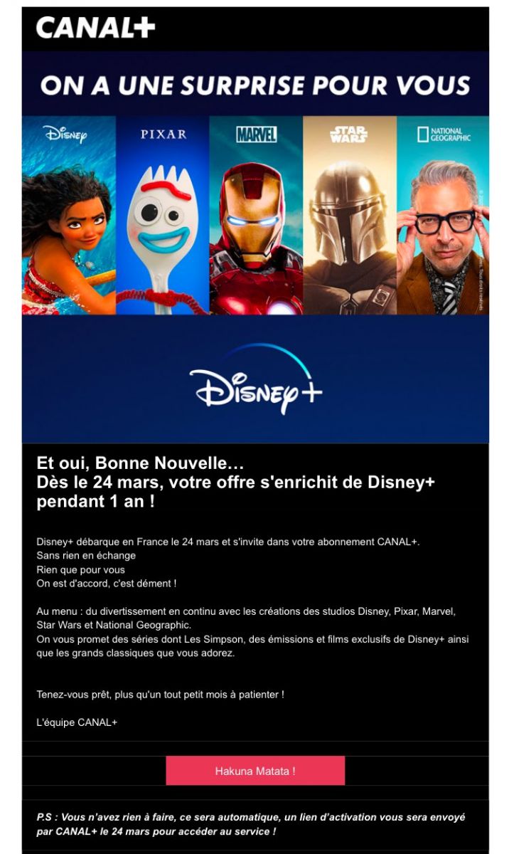 Canal+ commence à annoncer à ses abonnés que le service Disney+ sera offert durant 1 an