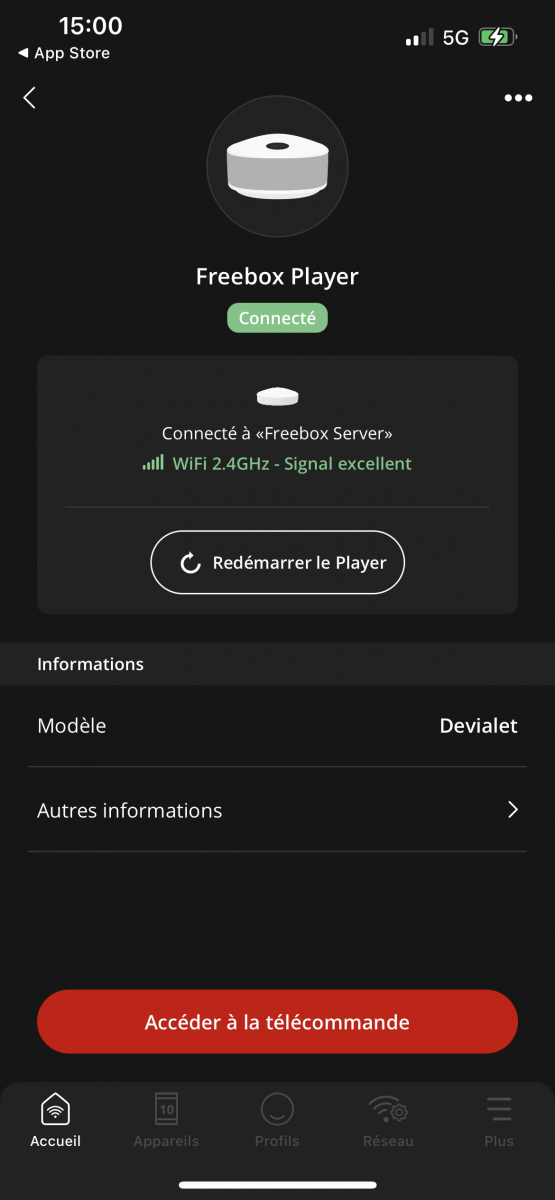 Pour utiliser cette télécommande virtuelle, il vous est nécessaire d’être connecté sur le même réseau que votre player. Il sera ainsi affiché dans la liste des appareils indiqués sur l’écran d’accueil de Freebox Connect et vous n’aurez qu’à cliquer dessus, puis sur le bouton “Accéder à la télécommande“.