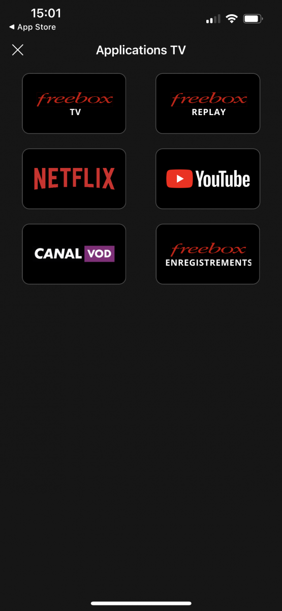 Une fois la connexion réalisée, vous aurez ainsi accès à une interface de télécommande assez classique, vous proposant de naviguer sur l’interface avec des croix directionnelles mais aussi d’agir sur le programme en accélérant, reculant, faisant une pause… Les boutons classiques de recherche, d’accès à la grille des programmes ainsi que le bouton “i” pour accéder à des informations et le retour sont également de la partie. Notons cependant deux particularités : la présence d’un bouton permettant de passer à un pavé numérique facilement pour saisir votre numéro de chaîne mais aussi un bouton dédié aux applications.