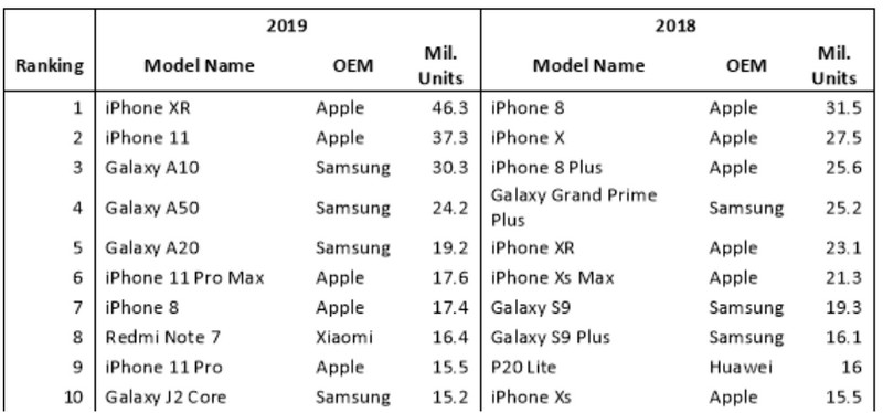 Le cabinet d’analyse Omdia vient de publier son classement des smartphones les plus vendus en 2019. Pour la moitié, ce sont des modèles iPhone. On y retrouve en effet l’iPhone XR introduit fin 2018, en 1ère place, mais également les iPhone 11, iPhone 11 Pro et iPhone 11 Pro Max lancés fin 2019, aux 2e, 9e et 6e places. Une bonne performance, sachant que la période de commercialisation de ces derniers se concentre sur quelques mois à peine, en 2019.