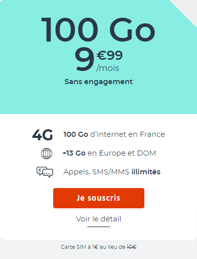 Sans engagement, le forfait de Cdiscount Mobile intègre par ailleurs les appels, SMS et MMS en illimité. Il prévoit également une enveloppe data pour le roaming, avec 13 Go disponibles depuis l’Europe et les DOM. Chose à noter : la carte SIM triple découpe, payable à la commande, coûte exceptionnellement 1 euros.
