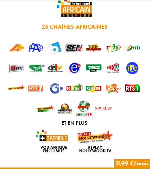 Avec l’ajout de Novelas TV, La pack africain premium intègre désormais 25 chaînes et 2 services de replay. Le tarif, lui, ne bouge pas et reste donc à 11,99€/mois. Pour s’y abonner, il suffit de se rendre sur une des chaînes ci-dessous depuis la zapliste de Freebox TV, de cliquer sur OK puis d’indiquer son code d’achat.